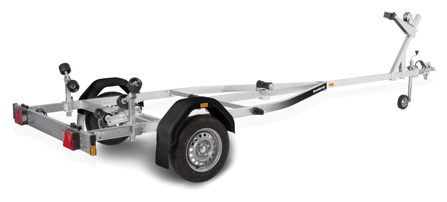 Obromsad trailer för mindre båtar upp till 18 fot, tippbar bakre vagga och justerbara sidorullar i hög kvalitet för enkel anpassning till din båt. Varmgalvaniserat chassi för lång hållbarhet. Elen är helt skyddad i båttrailerns chassi. Vattentäta hjullager förlänger livstiden. Justerbart vinschtorn. Enkel avtagbar ljusramp med quick-release-fästen för smidig av- och pålastning. Båttrailern på bilden kan vara extrautrustad. Kölrullsvagga Vinsch och justerbart vinschtorn