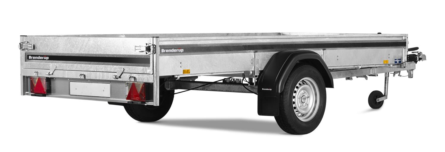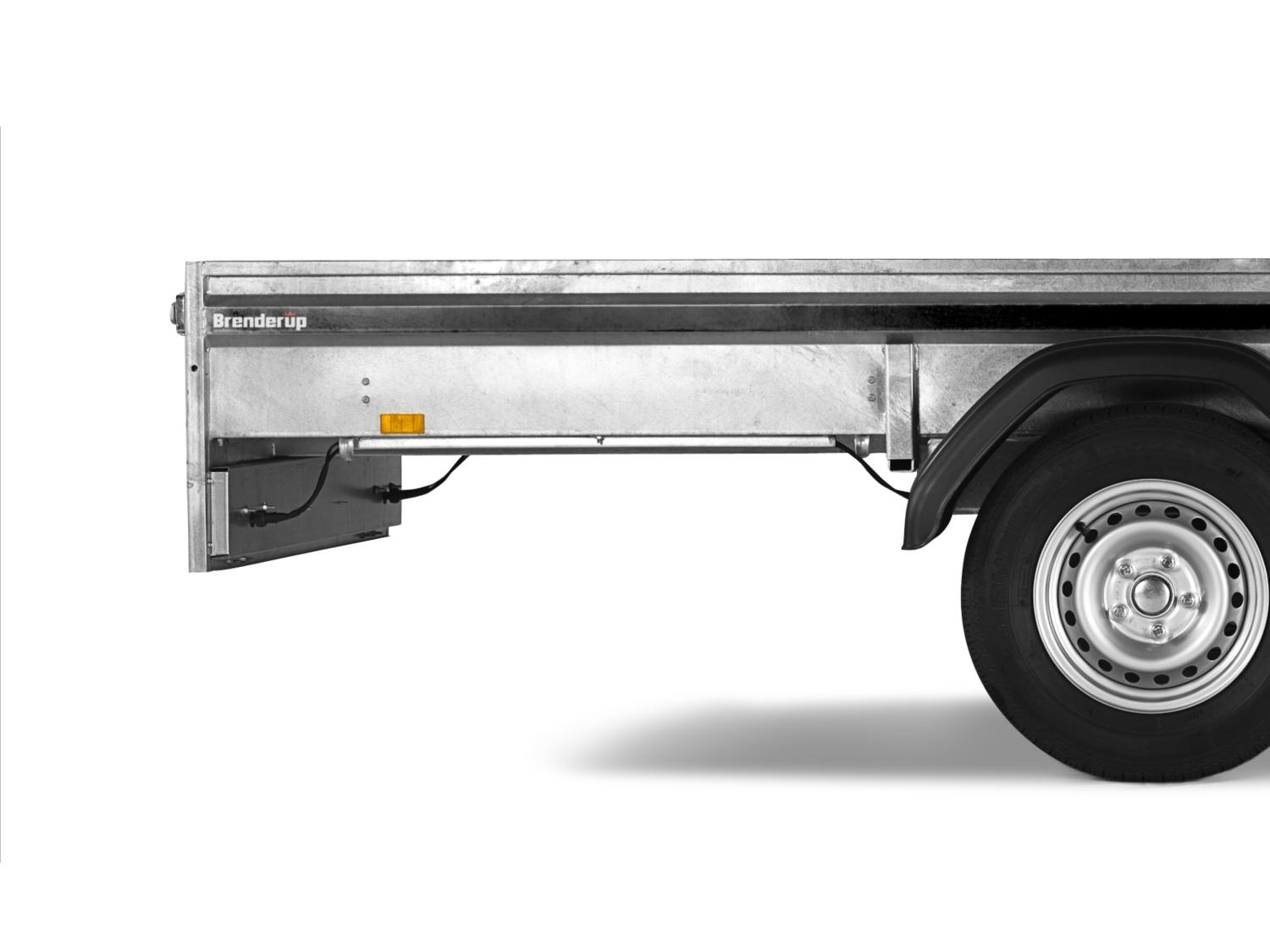 Professionell släpvagn för anläggnings- eller byggarbete, med låg tyngdpunkt för högre säkerhet och stabila köregenskaper. D-serien är ett pålitligt val vid transport av småmaskiner och smidig vid lastning och lossning. Vagnen på bilden kan vara extrautrustad. Fällbar fram- och bakläm Utvändiga bindkrokar