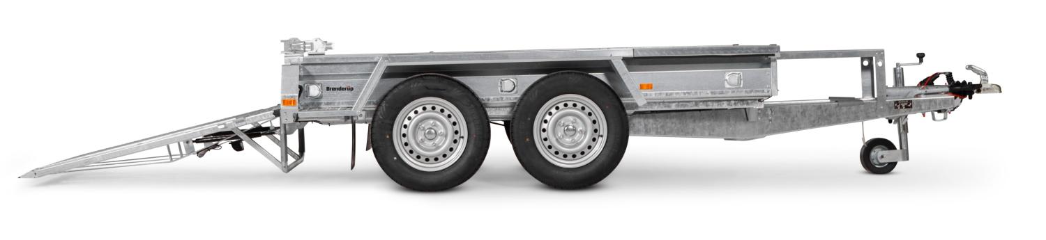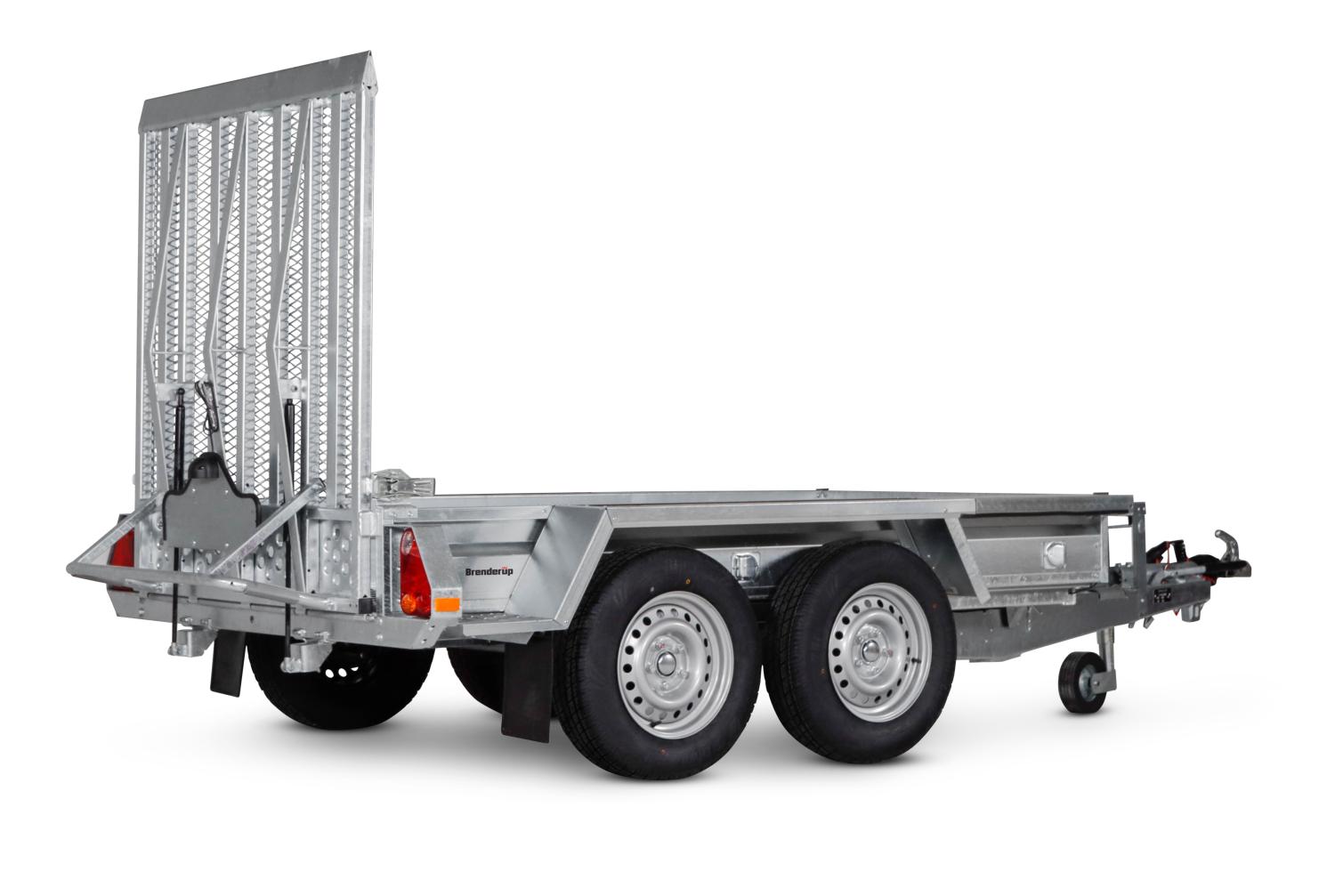 För entreprenörer och maskinuthyrare som fraktar små, tunga maskiner, t.ex. minigrävare och grävare. Utmärkt uppkörningsvinkel tack vare den långa rampen. Gångborden på sidorna gör det lätt att stiga in och ut ur lastade maskiner. Integrerade stödben förenklar lastning. Vagnen på bilden kan vara extrautrustad. Med robust plywood golv Stor och kraftig ramp, skopstöd är standard